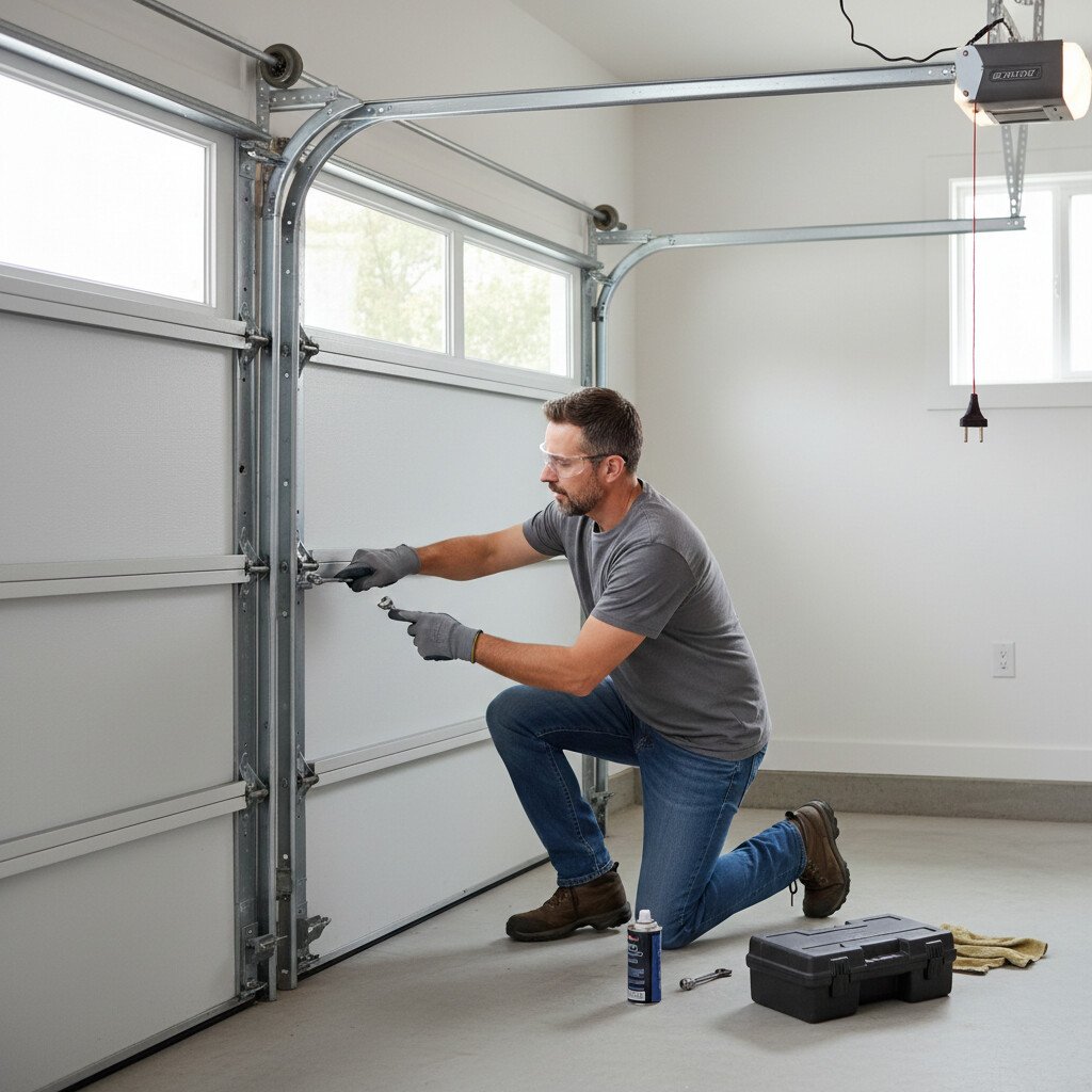 - Lubricate rollers, hinges, and springs with silicone (nylon) or white lithium (metal); avoid WD‑40 and cycle the door to distribute.