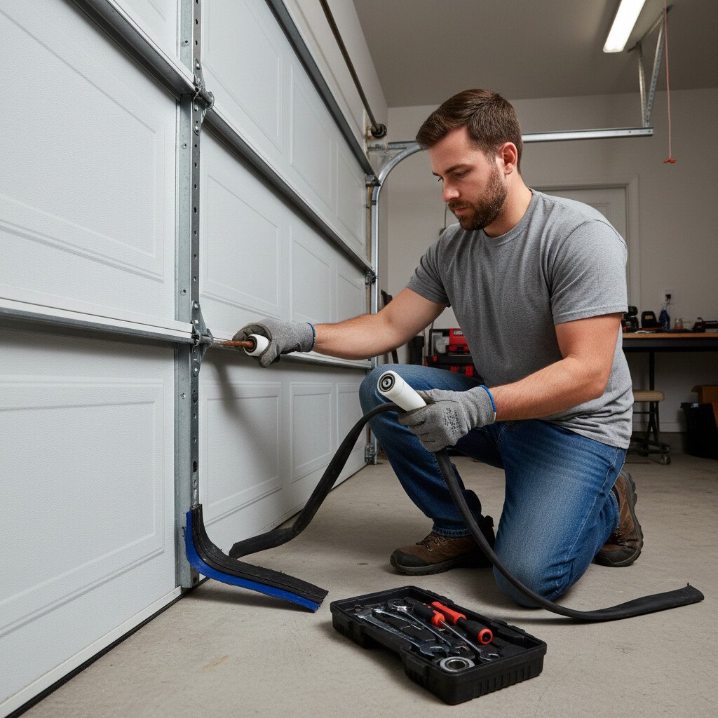 Replace bottom and side weatherstrip; clean channels, press in new vinyl, trim flush, ensure uniform seal. Note replacement frequency: rollers 5–7 years, hinges 7–10, weatherstrip 3–5. Test balance and travel.